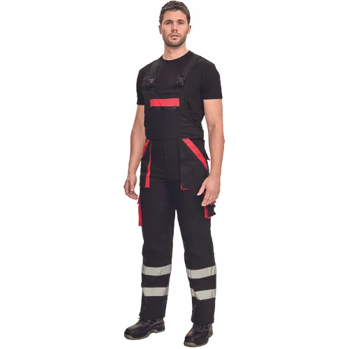 • bélelt férfi munkanadrág • széles pántok műanyag csatokkal • 2 első zseb, 2 oldalzseb • 1 nagy cipzáras mellzseb, 2 hátsó zseb • fényvisszavető csíkok a szárak alsó részén • megerősített térdrész