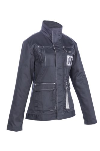 245 g/m2 vastag, kopásálló, sávolykötésű anyag, 60% pamut, 40% poliészter, női fazonú munkakabát,Álló gallér,Tépőzáras hajtókával fedett cipzár, Női szabás, 1 többrekeszes felső zseb, 1 fedett tépőzáras felső zseb + névkártyatartó, 1 cipzáras zseb,2 tépőzáras oldalzseb,2 bebújós oldalzseb,Tépőzárral állítható mandzsetta,Kontrasztos színek