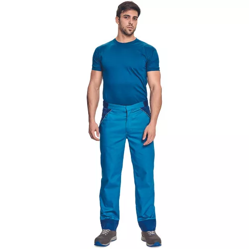 • férfi munkanadrág könnyű pamut-PES kevertszálas anyagból • dekoratív paszpol kontrasztos színekkel • hálós betétek • zsebfedős zsebek • a derékbőség tépőzárral állítható • 5 cm-rel leengedhető szárak • 2 első zseb, az egyikben D-gyűrű található • 1 hátsó zseb •tartós anyagú • puhább, hajlékonyabb szövet