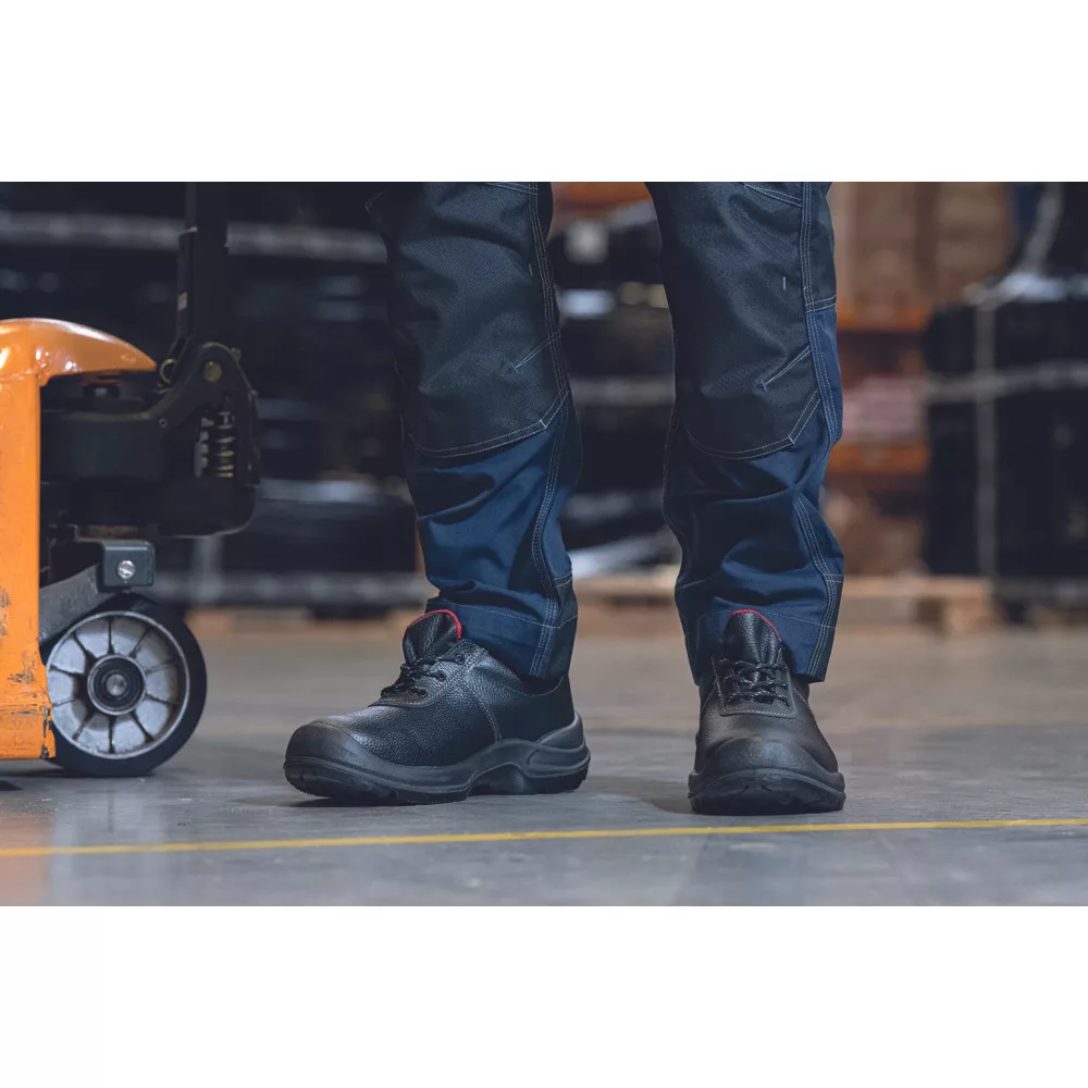 • biztonsági félcipő acél lábujjvédővel, átszúrás ellen védő köztalppal és kétrétegű PU/PU külső talppal • bőr felsőrész