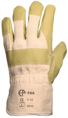 * sárga műbőr (PVC/nitril) alapanyagú, egybeszabott, tenyérfolt nélküli kesztyű* fehér vászon kézhát és mandzsetta* artéria-,köröm é sökölcsontvédő* pamut tenyérbélés