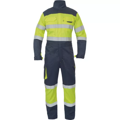 • HI-VIS multinorm overall cipzárral záródó kialakításban tépőzáras hajtókával, meghosszabbítható szárakkal. Praktikus kialakítás 2 oldalzsebbel, 2 zsebbel a szárakon • 2 mellzsebbel • és 2 hátsó zsebbel- tépőzárral záródó hajtókás kivitelben, tépőzárral szűkíthető mandzsettával. A derékrészen, az ujjakon és a szárakon egy pár 5 cm-es varrott fényvisszavető csíkkal van ellátva