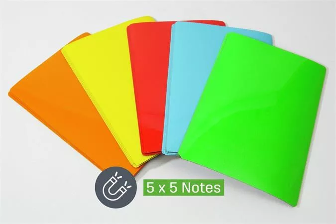 - a csomag 25 db mágneses jegyzetlapot tartalmaz, 5-5 db kék, sárga, zöld, narancssárga és piros színben