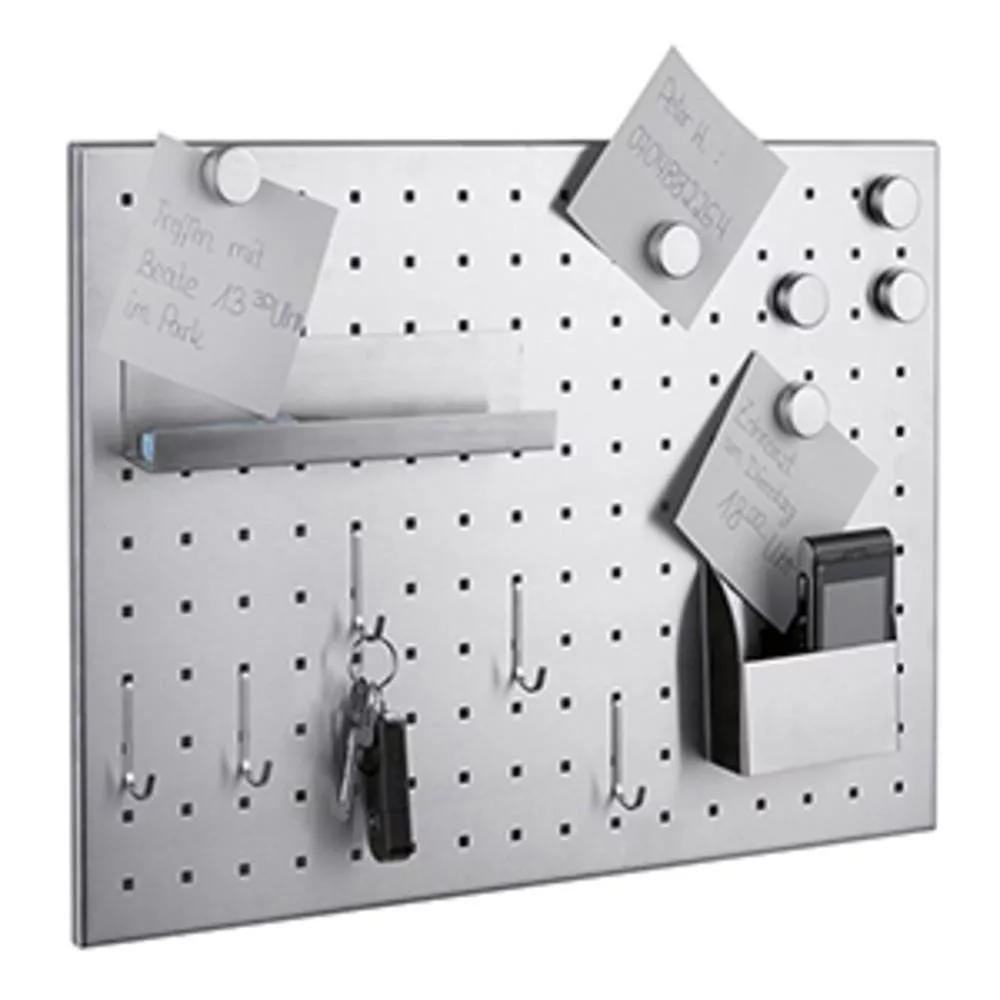 Mágneses tábla rozsdamentes acélból, szélesség x mélység x magasság 500x10x350 mm, perforált, tartozékokkal együtt