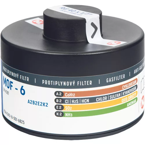 »MOF-6 A2B2E2K2 kombinált szűrőbetét zsinórmenettel, tömege 320 g; Alkalmazási területek (védőképesség): szerves, szervetlen, savas gázok és gőzök; Felhasználási területek: vegyipar, petrolkémia, élelmiszer- és gyógyszeripar, öntödék, laboratóriumok; Szabványok: EN 14387:2004, EN 148-1.