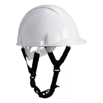 Szellőző sisak, magasságban történő munkavégzésre. Polietilén héj, 6 pontos fejkosár. Izzadtság szalaggal és 4 pontos állszíjjal.