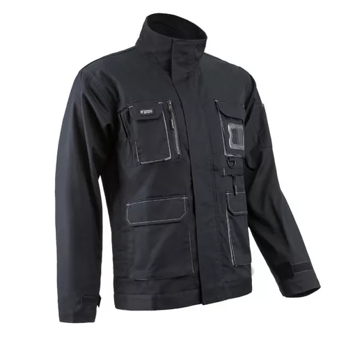 Twill: 60% pamut / 40% poliészter - 245 g/m2dzsekifazonú bikolor kabát tépőzárral állítható mandzsettávalállig érő húzózár, szennyeződésektől védő, tépőzáras cipzárfedővel, magas álló gallérbeépített névjegykártyatartóa betéttel azonos színű varrásokkét fedett rávarrt oldalzseb, két, cipzáras bebújós oldalzseb, egy fedett telefonzsebegy cipzáros, függőleges felső zseb, egy tolltartós felső zseb, egy rávarrt fedett felső zseb névjegykártyatartóvalegy vízszintes cipzáros zseb bal oldalon, egy tolltartós zseb a bal ujjonegy kitűzőtartó gyűrű