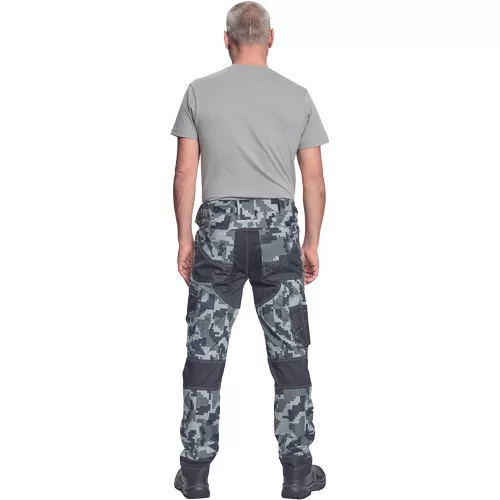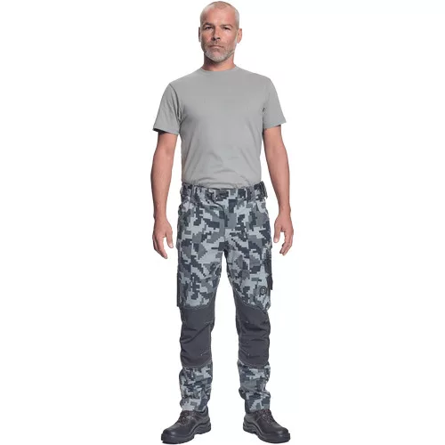 férfi munkanadrág innovatív, rugalmas TRIFIBETEX® anyagból, CORDURA® betétekkel digitális terepmintával, elöl 2 ékzseb, hátul 2 tépőzáras foltzseb, bal oldalt nagy multifunkciós zseb, jobb oldalt multifunkciós vonalzó, kés és ceruzatartó, fém "D" gyűrű, rugalmas derék, hosszabbítható szárhossz, fényvisszavető elemek, dekoratív tripla varrás kontrasztos színnel, kalapácstartó