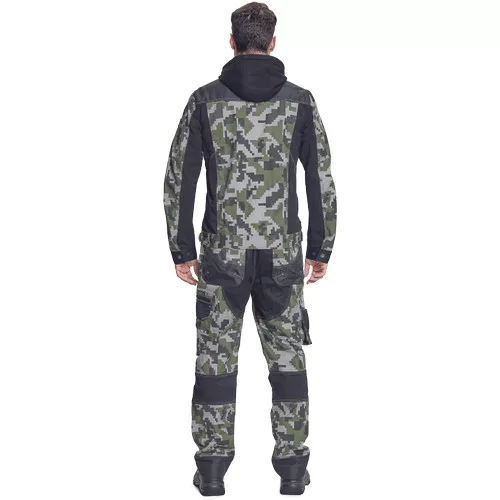 férfi munkanadrág innovatív, rugalmas TRIFIBETEX® anyagból, CORDURA® betétekkel digitális terepmintával, elöl 2 ékzseb, hátul 2 tépőzáras foltzseb, bal oldalt nagy multifunkciós zseb, jobb oldalt multifunkciós vonalzó, kés és ceruzatartó, fém "D" gyűrű, rugalmas derék, hosszabbítható szárhossz, fényvisszavető elemek, dekoratív tripla varrás kontrasztos színnel, kalapácstartó