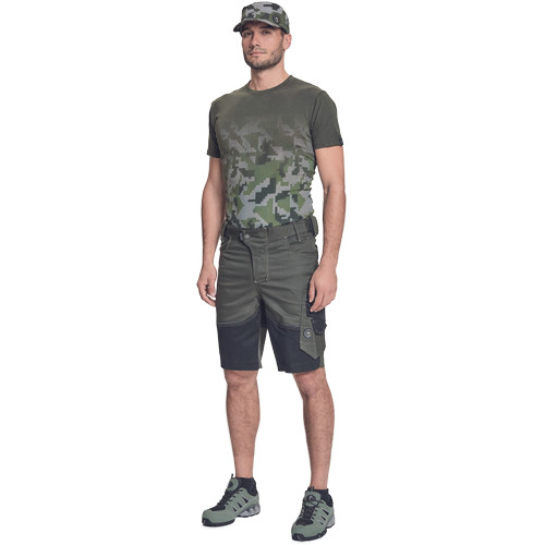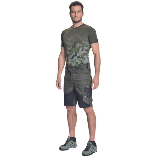 • férfi rövidnadrág innovatív, rugalmas Trifibetex® anyagból • 2 ékzseb • hátul 2 tépőzáras foltzseb • bal oldalon nagy multifunkciós zseb • jobb oldalon multifunkciós zseb vonalzónak • kés- és ceruzatartó • fém "D" gyűrű • rugalmas derék • fényvisszavető részletek • dekoratív tripla varrás kontrasztos színnel • kalapácstartó