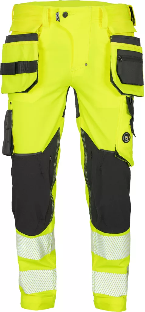 Férfi HI-VIS munkanadrág egyedi négyirányú stretch anyagból, Trifibetex-VIS® alapanyagból, melyet 2 eltávolítható, multifunkcionális lengőzseb egészít ki • 2 elülső ékzseb • 2 hátsó felvarrt zseb tépőzárral • nagy multifunkcionális zseb a bal combon • jobb combon multifunkcionális zseb kés és mérőeszközök tárolására • CORDURA® megerősítés a térdrészen, opcionális térdvédő behelyezési lehetőséggel • tartós hármas varrás a szárakon és az üleprészen• rugalmas derék • állítható lábhossz • 7,5 cm széles nyomtatott és szegmentált fényvisszavető csíkok • színben harmonizáló fényvisszavető részletek