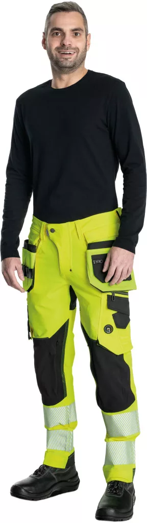 Férfi HI-VIS munkanadrág egyedi négyirányú stretch anyagból, Trifibetex-VIS® alapanyagból, melyet 2 eltávolítható, multifunkcionális lengőzseb egészít ki • 2 elülső ékzseb • 2 hátsó felvarrt zseb tépőzárral • nagy multifunkcionális zseb a bal combon • jobb combon multifunkcionális zseb kés és mérőeszközök tárolására • CORDURA® megerősítés a térdrészen, opcionális térdvédő behelyezési lehetőséggel • tartós hármas varrás a szárakon és az üleprészen• rugalmas derék • állítható lábhossz • 7,5 cm széles nyomtatott és szegmentált fényvisszavető csíkok • színben harmonizáló fényvisszavető részletek