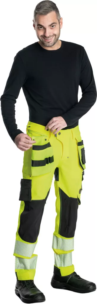 Férfi HI-VIS munkanadrág egyedi négyirányú stretch anyagból, Trifibetex-VIS® alapanyagból, melyet 2 eltávolítható, multifunkcionális lengőzseb egészít ki • 2 elülső ékzseb • 2 hátsó felvarrt zseb tépőzárral • nagy multifunkcionális zseb a bal combon • jobb combon multifunkcionális zseb kés és mérőeszközök tárolására • CORDURA® megerősítés a térdrészen, opcionális térdvédő behelyezési lehetőséggel • tartós hármas varrás a szárakon és az üleprészen• rugalmas derék • állítható lábhossz • 7,5 cm széles nyomtatott és szegmentált fényvisszavető csíkok • színben harmonizáló fényvisszavető részletek