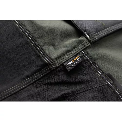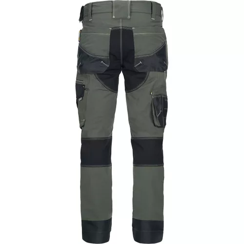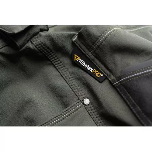 férfi munkanadrág innovatív, 4 irányban rugalmas TRIFIBETEX PRO® anyagból, kerek első zsebekkel, hátul 2 tépőzáras foltzsebbel, bal oldalt nagy multifunkciós zsebbel, jobb oldalt multifunkciós vonalzó, kés- és ceruzatartó és kalapácstartó is található. Fém "D" gyűrűvel. A Cordura® anyagból készült térderősítés egyben zseb is a behelyezhető térdelő szivacsnak. Derékon gumírozással, a nadrág szárában 5 cm leengedhető anyag van. Fényvisszavető elemek, dekoratív tripla varrás kontrasztos színnel hívja fel a figyelmet a ruhadaradra.