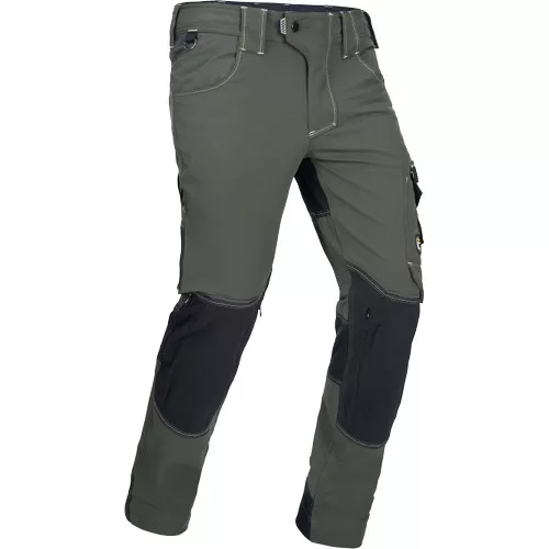 férfi munkanadrág innovatív, 4 irányban rugalmas TRIFIBETEX PRO® anyagból, kerek első zsebekkel, hátul 2 tépőzáras foltzsebbel, bal oldalt nagy multifunkciós zsebbel, jobb oldalt multifunkciós vonalzó, kés- és ceruzatartó és kalapácstartó is található. Fém "D" gyűrűvel. A Cordura® anyagból készült térderősítés egyben zseb is a behelyezhető térdelő szivacsnak. Derékon gumírozással, a nadrág szárában 5 cm leengedhető anyag van. Fényvisszavető elemek, dekoratív tripla varrás kontrasztos színnel hívja fel a figyelmet a ruhadaradra.