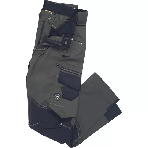 férfi munkanadrág innovatív, rugalmas TRIFIBETEX PRO® anyagból, elöl 2 ékzseb, hátul 2 tépőzáras foltzseb, bal oldalt nagy multifunkciós zseb, jobb oldalt multifunkciós vonalzó, kés és ceruzatartó, fém "D" gyűrű, rugalmas derék, hosszabbítható szárhossz, fényvisszavető elemek, dekoratív tripla varrás kontrasztos színnel, kalapácstartó