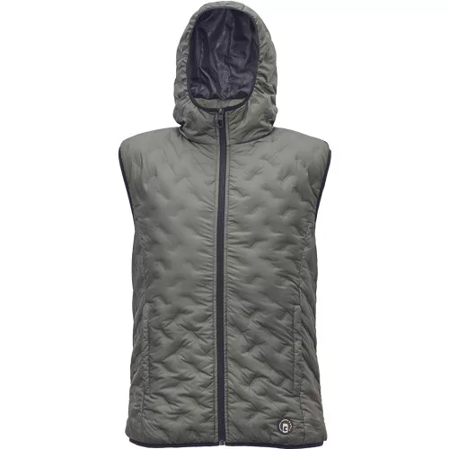 Markáns vonalvezetésű, tollpehely bélésű, cipzáras mellény kapucnival. Modern kialakítású, kényelmesen feszülő vonalainak köszönhetően stílusos megjelenést kölcsönöz. Gumírozott derékrésszel és két mély, cipzárral záródó oldalzsebbel készül. Anyaga 100% poliészter. Bélés 100 % poliészter, 70 g/m², taffeta. Töltőanyag: 905 tollpehely, 10% toll.