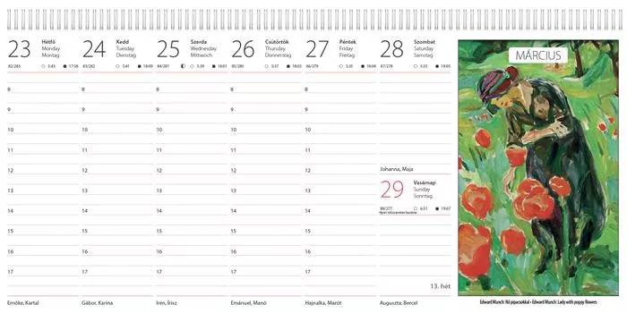 Minden irodában nélkülözhetetlen. Senki sem vitathatja, hogy az asztali naptárak az irodavilág egy leghasznosabb segítői. Ha Önnek fontos a pontosság, az időpontok betartása és ezáltal az ügyfelek elégedettsége, akkor a cég egyik asztaláról sem hiányozhatnak ezek a tervező alkalmatosságok. -időbeosztás: félórás, 8-17.00 h -magyar-angol-német nyelvű naptárháló -névnapok, magyar ünnepek és hasznos információk minden napra -extra sorok a munkaidőn túli események feljegyzésére -elegáns fém ikerspirál a szebb megjelenésért -magyar-angol nyelvű képleírások -válogatott színes képek minden hétre -méret: 320x150 mm -reklámfelület: 320x40 mm -27 lap -12 kép -lap típusa 115 g/m2, fehér ofszet