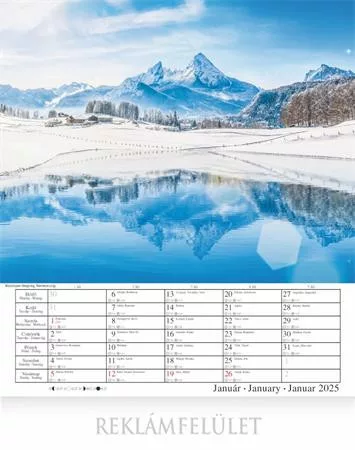 -naptár rész: magyar, angol, német nyelven, magyar  ünnepek  és névnapokkal, napkelte, napnyugta és holdállás  feltüntetésével