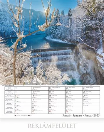 -naptár rész: magyar, angol, német nyelven, magyar ünnepek és névnapokkal, napkelte, napnyugta és holdállás feltüntetésével
