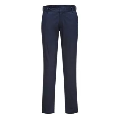 Ez a női slim fit stretch chino a tökéletes választás az uniformizált öltözékhez. Modern, slim fit szabású, dinamikus pamut stretch twill alapanyagból készült. A stretch szövet a legnagyobb kényelmet és mozgásszabadságot biztosítja. Jellemzői közé tartoznak az oldalzsebek, a hátsó gombos zseb és a derékon található kampók és pántos rögzítés. Rendkívül tartós, mindenhol ikeröltésekkel és szegéssel ellátva az összes stresszponton.