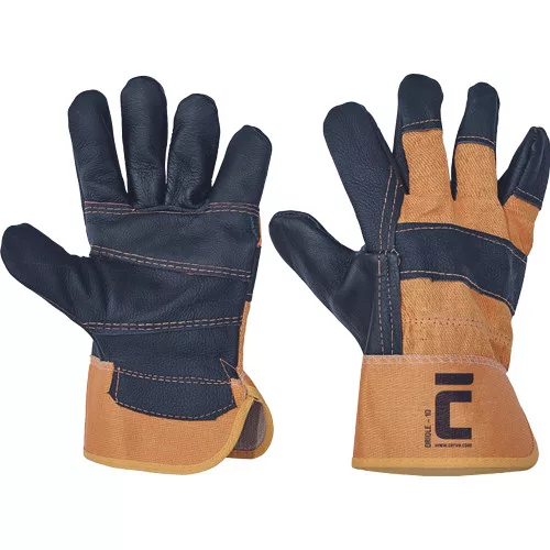 • egyszínű bútoripari marha színbőr kesztyű • bélelt tenyér , pamutszövet kézfej, merev mandzsetta