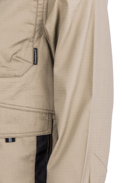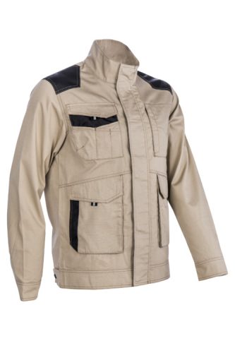 240 g/m2 vastag, 35% pamut + 65% poliészter kevertszálas ripstop (továbbszakadás biztos) alapanyag homokszínű kabát, kopásálló Oxford PES betétekkel megerősítve az erősebben igénybe vett területeken: vállak, zsebek körül,egyenes szabású, modern dzsekifazonú bikolor munkakabát, szerelők számára kifejlesztve,állig érő húzózár, szennyeződésektől védő, patentos cipzárfedővel, magas gallérral,patenttal állítható mandzsetta és derékrész, egy cipzáras felső zseb, egy tépőzáras fedett felső zseb, két tépőzáras fedett, bebújós függőleges nyílású oldalzseb