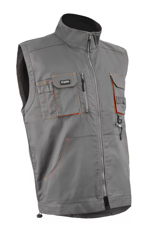 * 245 g/m2 vastag, kopásálló, sávolykötésű anyag, 60% pamut, 40% poliészter* szürke-narancs színű mellény,egyenes szabású állig érő húzózárral, állítható aljrésszel * a betéttel azonos színű varrással, magas gallérral, hosszított hátrésszel* két rávarrt oldalzseb, egy fedett telefonzseb, egy cipzáros függőleges felső zseb, egy tolltartós felső zseb, egy rávarrt fedett felső zseb, egy vízszintes cipzáros zseb bal oldalon, egy kitűzőt tartó gyűrű