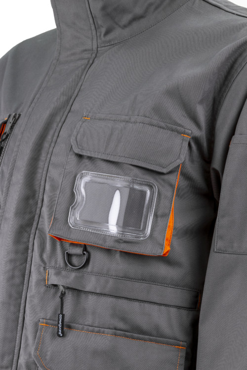 * 245 g/m2 vastag, kopásálló, sávolykötésű anyag, 60% pamut, 40% poliészter,szürke alapszínű ,testbarát alapanyag,a betéttel azonos színű varrásokkal* dzseki fazonú,bikolor kabát tépőzárral állítható mandzsettával * állig érő húzózár, szennyeződésektől védő, tépőzáras cipzárfedővel, magas álló gallér* beépített névjegykártya-tartó ,egy rávarrt fedett felső zseb névjegykártya-tartóval , egy vízszintes cipzáros zseb bal oldalon és több praktikus zseb