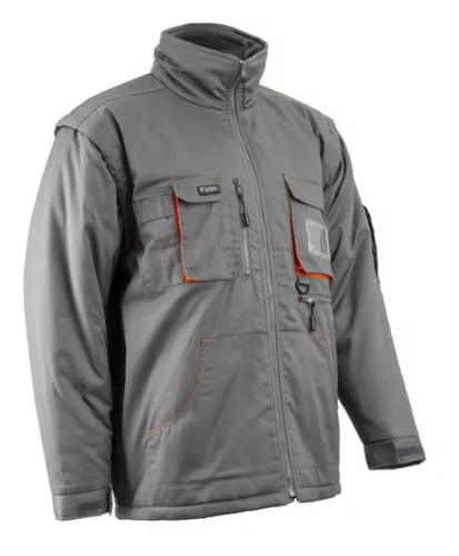 * 245 g/m2 vastag, 60% pamut+40% poliészter kevert szálas sávolykötésű alapanyag,hideg elleni minősítéssel rendelkező szürke kabát narancs színű kontraszt betétekkel * melegbélés: 220 g/m2 vastag, 100% poliészter,belső bélés: 110 g/m2 vastag 80% pamut és 20% poliészter* bélelt levehető kapucni,az álló gallér tetejéig húzódó cipzár,* levehető ujjak és tépőzárral állítható mandzsetta* 2 rátétes oldalzseb 1 felső zseb többrekeszes kiegészítéssel, 1 felső zseb névkártya tartóval,egy vízszintes cipzáros zseb bal oldalon,egy tolltartós zseb a ball ujjon,egy kitűző-tartó gyűrűegy függőleges cipzáras paszpól zseb