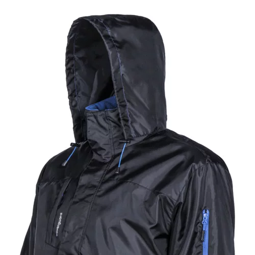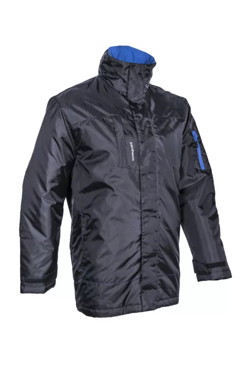 Panda fekete/kék télikabát* Oxford: PU-val borított 100% poliészter 250D x 200D* Melegbélés: 100% poliészter - 160 g/m2 (testen és az ujjakon) és 80 g/m2 a galléron* Polárral bélelt álló gallérba rejtett Oxford alapanyagú kapucni rugalmas húzózsinórral* Tépőzáras hajtókával fedett cipzár* Tépőzárral állítható mandzsetta és rugalmas húzózsinórral állítható aljrész* 1 paszpólos fedett cipzáras mellzseb, 2 paszpólos fedett cipzáras alsó zseb, 1 cipzáras, kontraszt színű zseb a kabát ujján, 1 tépőzáras belső zseb* Szitázható