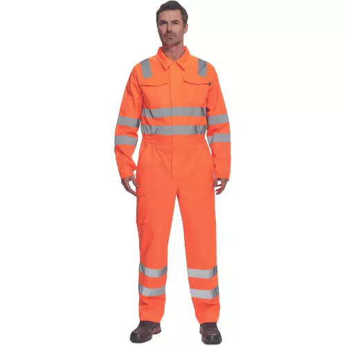 • férfi Hi-Vis overall 5 cm széles fényvisszavető csíkokkal • hajtókával fedett cipzár • 2 első zseb, 1 érmezseb • 1 multifunkciós oldalzseb a száron • 2 hátsó zseb • 2 zsebfedős mellzseb • rugalmas betét a derékrészen • leengedhető szárak