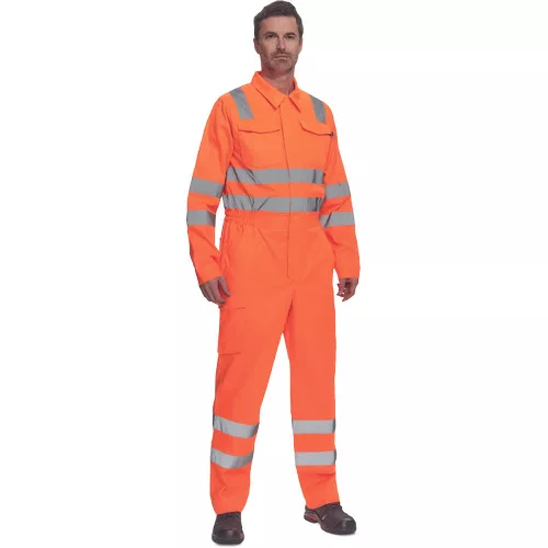 • férfi Hi-Vis overall 5 cm széles fényvisszavető csíkokkal • hajtókával fedett cipzár • 2 első zseb, 1 érmezseb • 1 multifunkciós oldalzseb a száron • 2 hátsó zseb • 2 zsebfedős mellzseb • rugalmas betét a derékrészen • leengedhető szárak