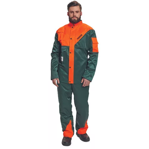 • férfi láncfűrészes kabát • rövid gallér polár béléssel • 1 cipzáras mellzseb • 1 zsebfedős telefonzseb • 1 karzseb • cipzárral záródó kialakítás patentos hajtókával • rugalmas belső mandzsettával • szellőző, bővítéssel ellátott hátrész
