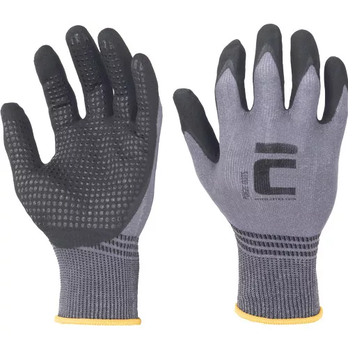 • varrat nélküli nylon és spandex kesztyű speciális nitrilhab mártással, amely biztosítja a hosszú élettartamot • kiváló tapadás száraz és olajos körülmények között • érintőképernyő barát • légáteresztő • rendkívüli védelem a kopás ellen, több mint 19 • 500 ciklust kibír • tűfinomság: 15 gg • nitril pöttyözé a tenyéren és az ujjakon a tapadás növelése érdekében
