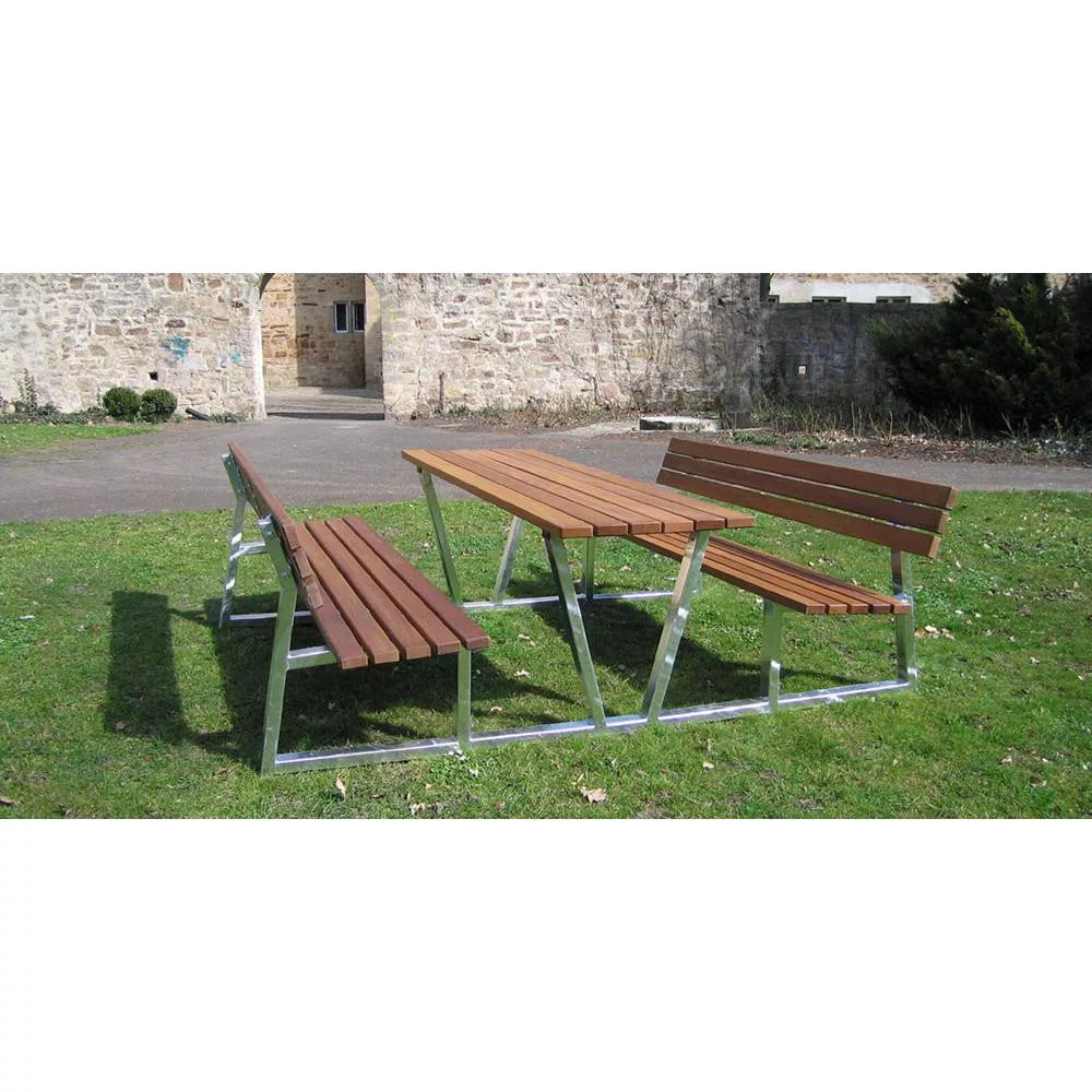Padgarnitúra téglalap alakú acélcső lábakkal, 2 pad + asztal, tűzihorganyzott, hossza 2 m, északi lucfenyő lécek