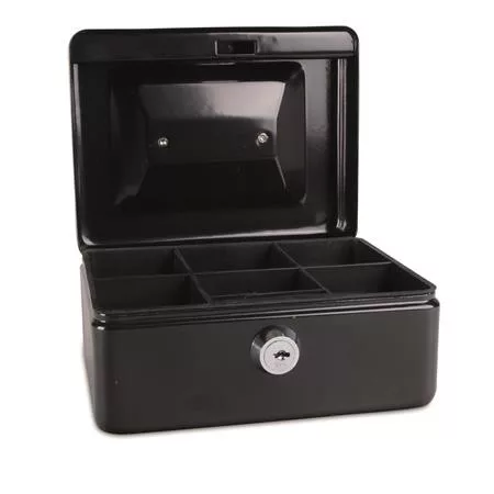 Lakkozott felületű, zárható, fém pénzkazetta -érmetartó tálca -lekerekített sarkok -hordozó fogantyú -2 db kulcs -méret: 152x115x80 mm