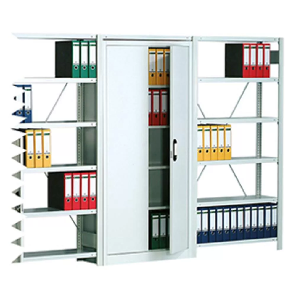 Polc-szekrény kombináció, világosszürke ral 7035, 1 felső polc, 4 szekrénypolc, ajtó ma 1950 mm, szé x mé x ma 1005x300x2000 mm