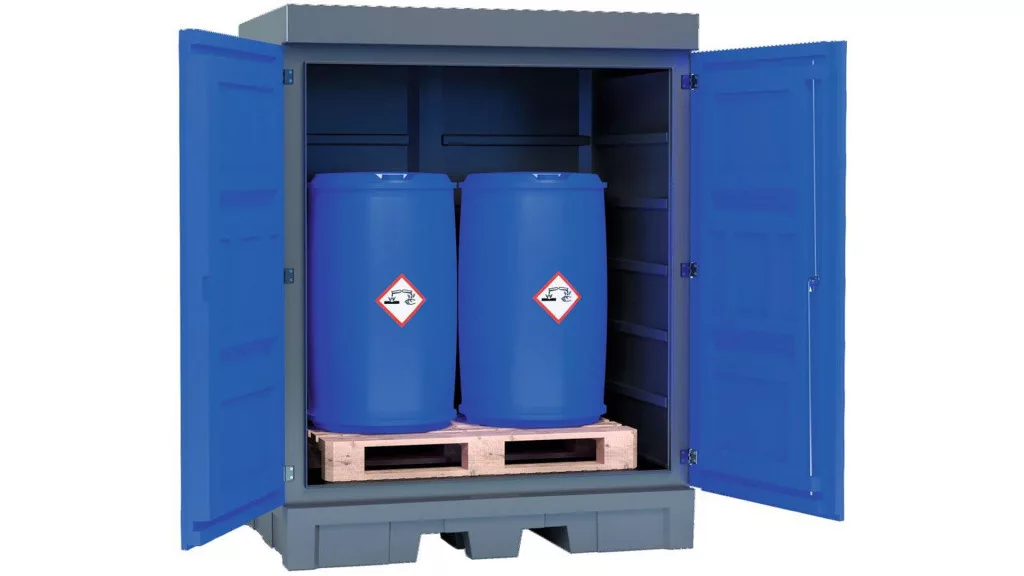 Polietilénből készült veszélyesanyag-tároló, kis tartályok tárolására, gyűjtőtérfogat 250 l, széxméxma 1560x1080x1980 mm