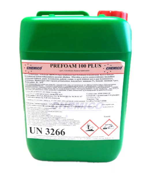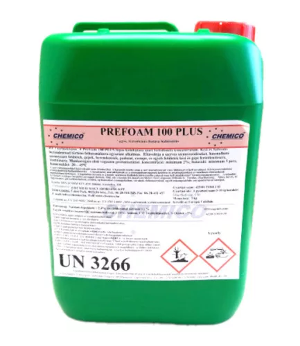 A Prefoam 100 PLUS folyékony, lúgos kémhatású ipari tisztító-fertőtlenítő koncentrátum. A termékben lévő lúgtartalom, a benne lévő adalékanyagok mennyisége jó tisztító, az aktív klór pedig kiváló fertőtlenítő hatást biztosít a szernek. PT 2 terméktípus. Baktericid, fungicid hatásspektrum.