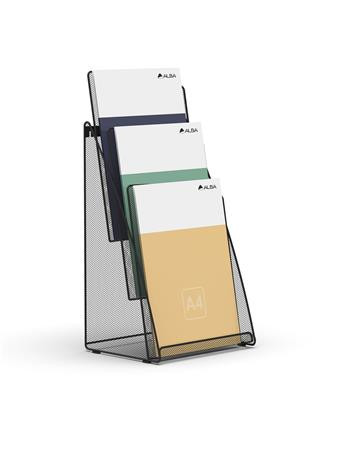 Prospektustartó, fémhálós, asztali, álló, A4, 3 rekesz, ALBA, fekete