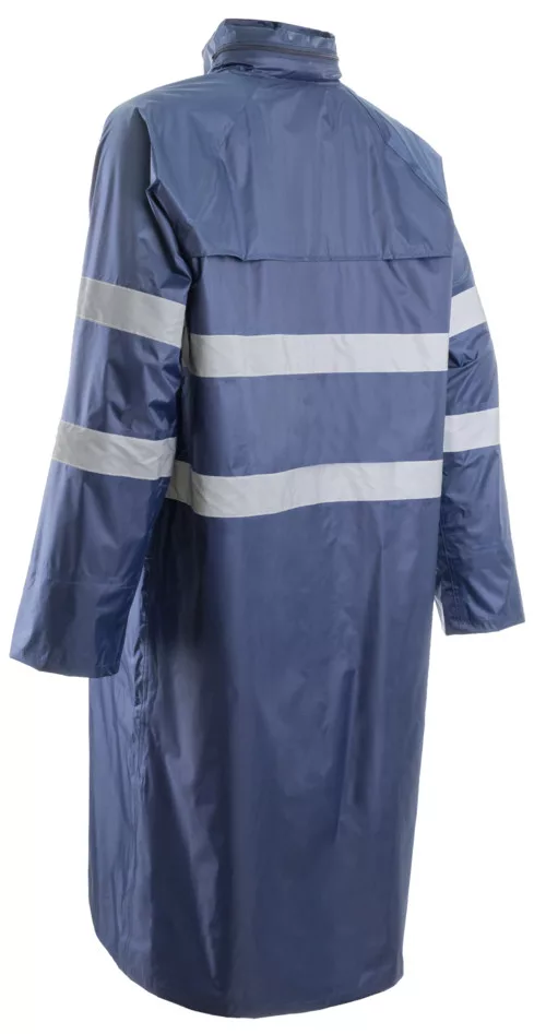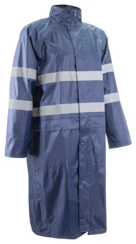 Rainet orkán esőkabát sötétkék színben* Lágy PVC-vel borított 100% poliészter - 200 g/m2 + 50 g/m2 hálós bélés* Vízállóság: 2000 mm* 5 cm széles fényvisszaverő csíkok – varrott és mikrogyöngyös technológia - 2 – 2 a testen és a karokon * Magas álló gallér végéig futó, patentos hajtókával fedett cipzár* Fedett varrások, gallérba rejtett kapucni húzózsinórral* Raglán szabású ujjak, szélálló gumírozott mandzsetta* 2 fedett oldalzseb, 1 fedett oldalzseb, * Szellőző hátrész, szellőzőlyukak a hónaljrésznél * 120 cm hosszú, szín: sötétkék