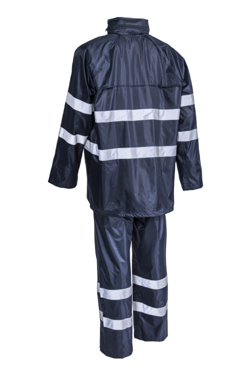 * 200 g/m2 vastag, 100% poliészterre mártott lágy PVC * 5 cm széles fényvisszaverő csík: 2 a test körül és 2 a karokon + 2 a lábszáron* az alapanyag vízállósága: 2000 mm * kétrészes ruha (kabát + nadrág)