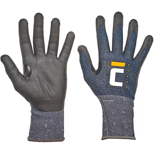 • kötött vágásbiztos védőkesztyű, C szintű vágásvédelemmel, a tenyéren PU mártással, rugalmas mandzsettával • Hüvelyk és mutatóujj között erősített • tűfinomság: 18gg