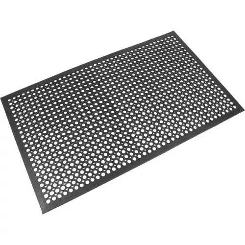 »Fáradtságcsökkentő gumi szőnyeg megemelt kör alakú felülettel a hatékony csúszásgátás érdekében. A kör alakú nyílások felfogják a törmelékeket, ugyanakkor elvezetik a felesleges folyadékot, így segítenek megelőzni az esetleges csúszásokat. A formázott, lekerekített élek csökkentik a megbotlás kockázatát, illetve lehetővé teszik a kerekekkel történő közlekedést.