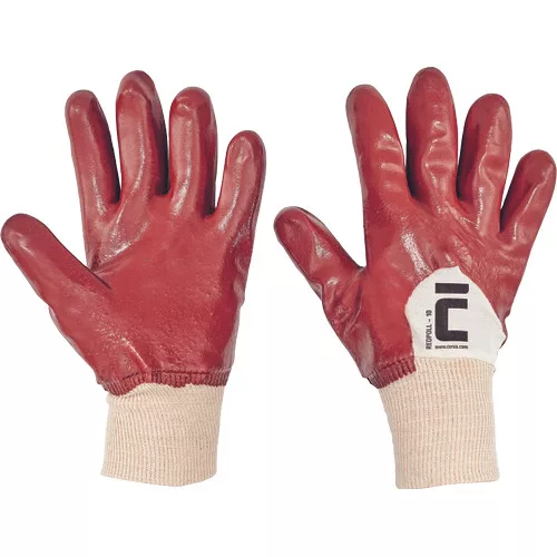 • kötött pamutkelméből varrt, ökölcsontig PVC-be mártott védőkesztyű rugalmas, kötött mandzsettával