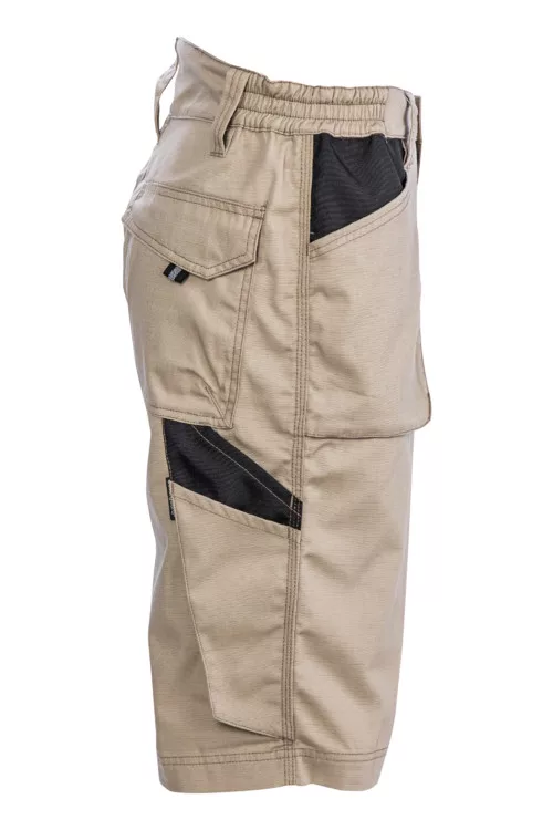 * 240 g/m2 vastag, 35% pamut + 65% poliészter kevertszálas ripstop (továbbszakadás biztos) alapanyag homok színbenkopásálló Oxford 600D PES betétekkel megerősített az erősebben igénybe vett területeknél.* modern formai kialakítású bermuda, szerelők számára kifejlesztve* övbújtatók, biztonsági tripla varrás és megemelt derékrészgombbal és cipzárral záródó, gumírozott derék* két rávarrt oldalzseb,két tépőzáras fedett farzseb,egy cargo zseb több rekesszel,egy dupla rekeszes vonalzó zseb,kalapácstartó hurok