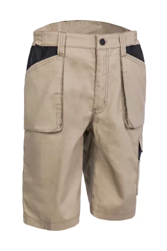 * 240 g/m2 vastag, 35% pamut + 65% poliészter kevertszálas ripstop (továbbszakadás biztos) alapanyag homok színbenkopásálló Oxford 600D PES betétekkel megerősített az erősebben igénybe vett területeknél.* modern formai kialakítású bermuda, szerelők számára kifejlesztve* övbújtatók, biztonsági tripla varrás és megemelt derékrészgombbal és cipzárral záródó, gumírozott derék* két rávarrt oldalzseb,két tépőzáras fedett farzseb,egy cargo zseb több rekesszel,egy dupla rekeszes vonalzó zseb,kalapácstartó hurok