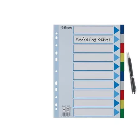 - elválasztólap visszafogott színkombinációkban - nagyméretű téglalapok az előlapon a tartalom feltüntetésére - 0,12 mm vastag PP alapanyag - hagyományos, 11-lyukú lefűzőrész - 10 színes fül a könnyű rendszerezéshez - megerősített lefűzőrész az előlapon