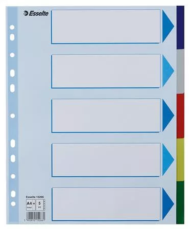 - elválasztólap visszafogott színkombinációkban - nagyméretű téglalapok az előlapon a tartalom feltüntetésére - 0,12 mm vastag PP alapanyag - hagyományos, 11-lyukú lefűzőrész - 5 színes fül a könnyű rendszerezéshez - megerősített lefűzőrész az előlapon - az A4+ méretű elválasztólapok szélesebbek a lefűzhető tasakoknál, így segítségükkel az iratrendezőbe lefűzött tasakok is könnyen rendszerezhetők
